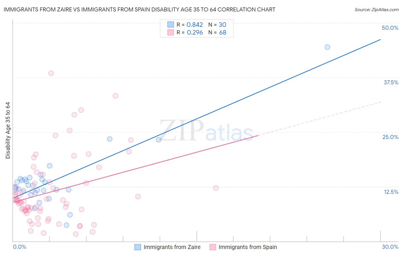 Immigrants from Zaire vs Immigrants from Spain Disability Age 35 to 64 Correlation Chart