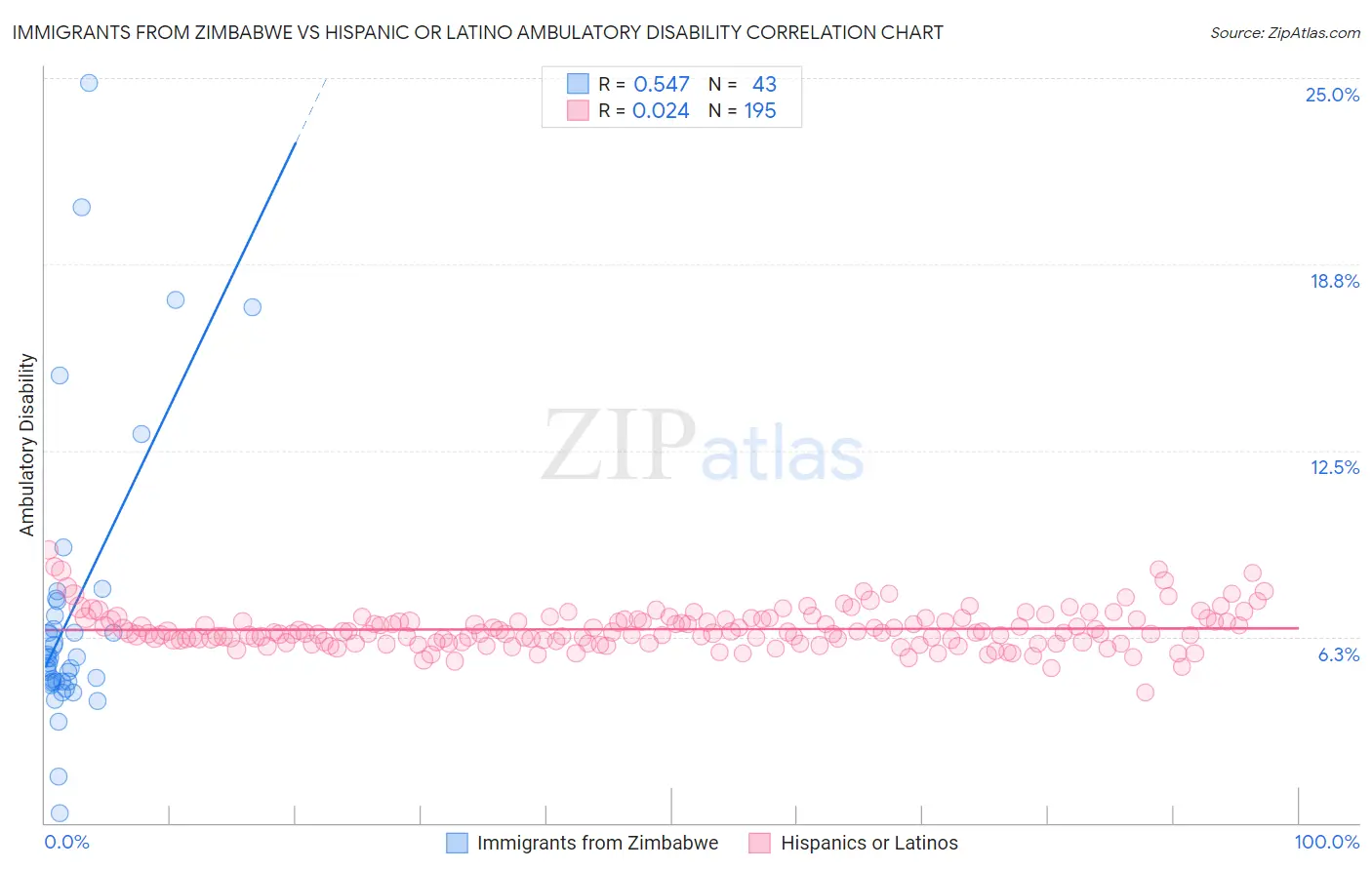 Immigrants from Zimbabwe vs Hispanic or Latino Ambulatory Disability Correlation Chart