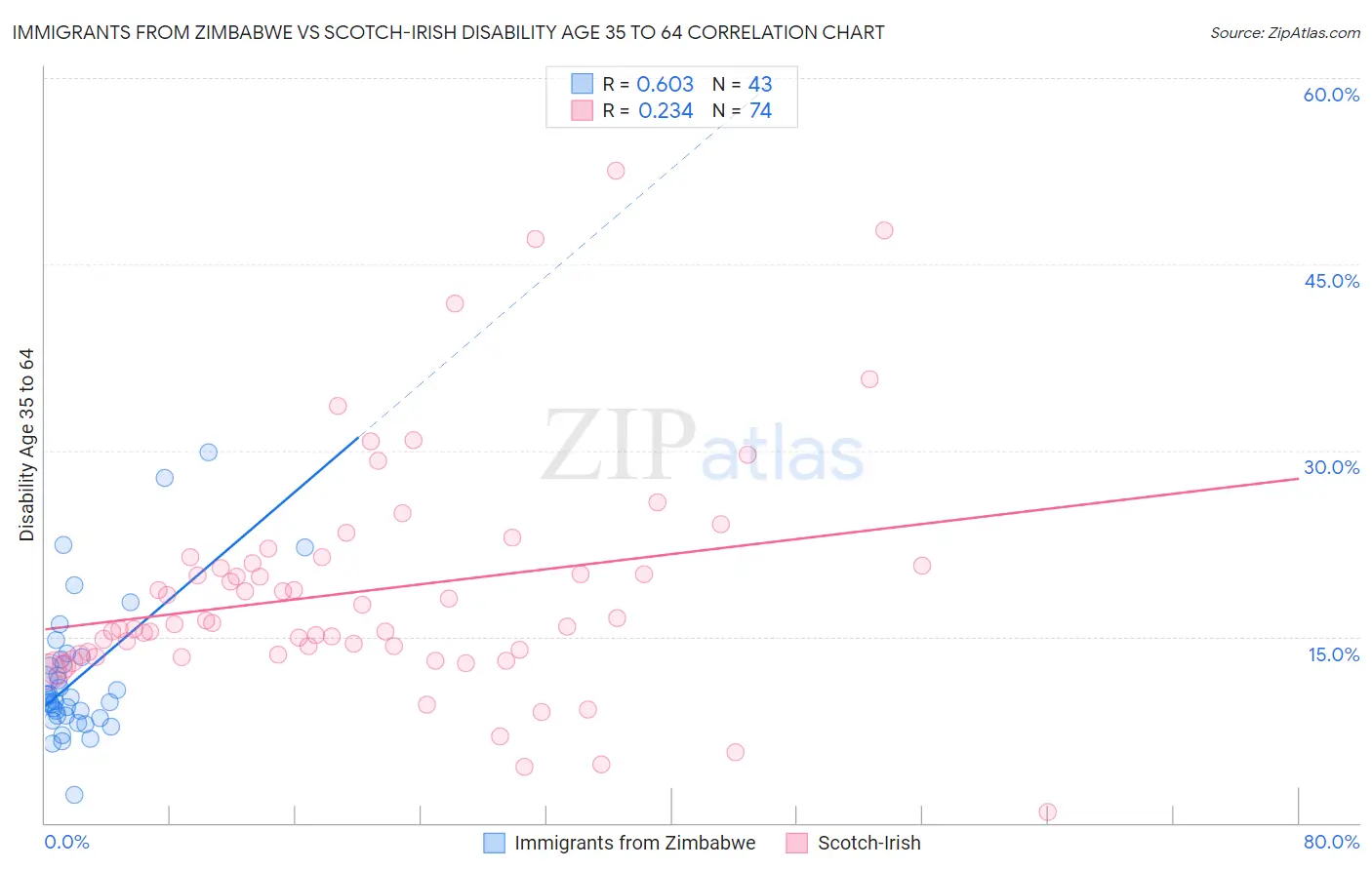 Immigrants from Zimbabwe vs Scotch-Irish Disability Age 35 to 64 Correlation Chart