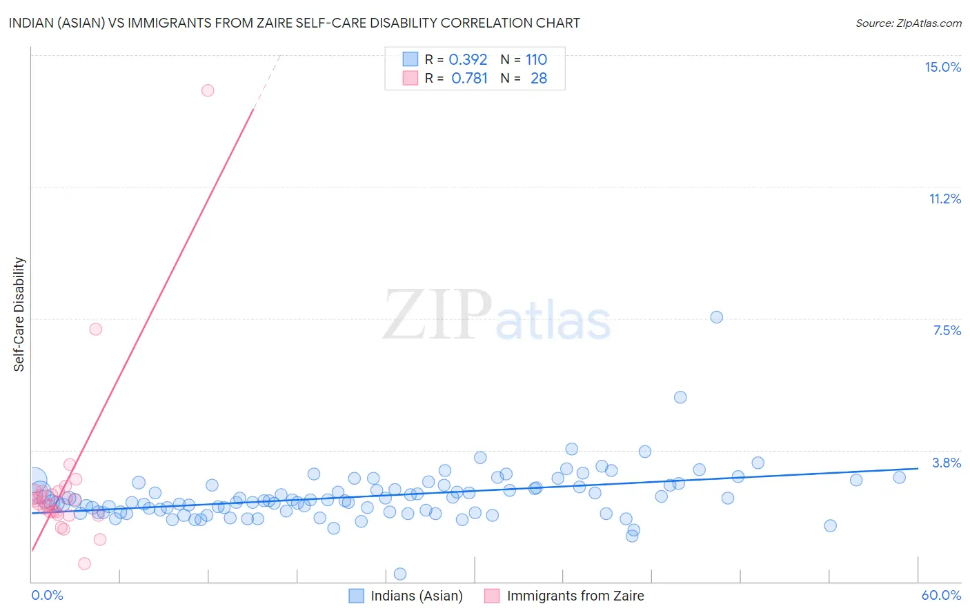 Indian (Asian) vs Immigrants from Zaire Self-Care Disability Correlation Chart