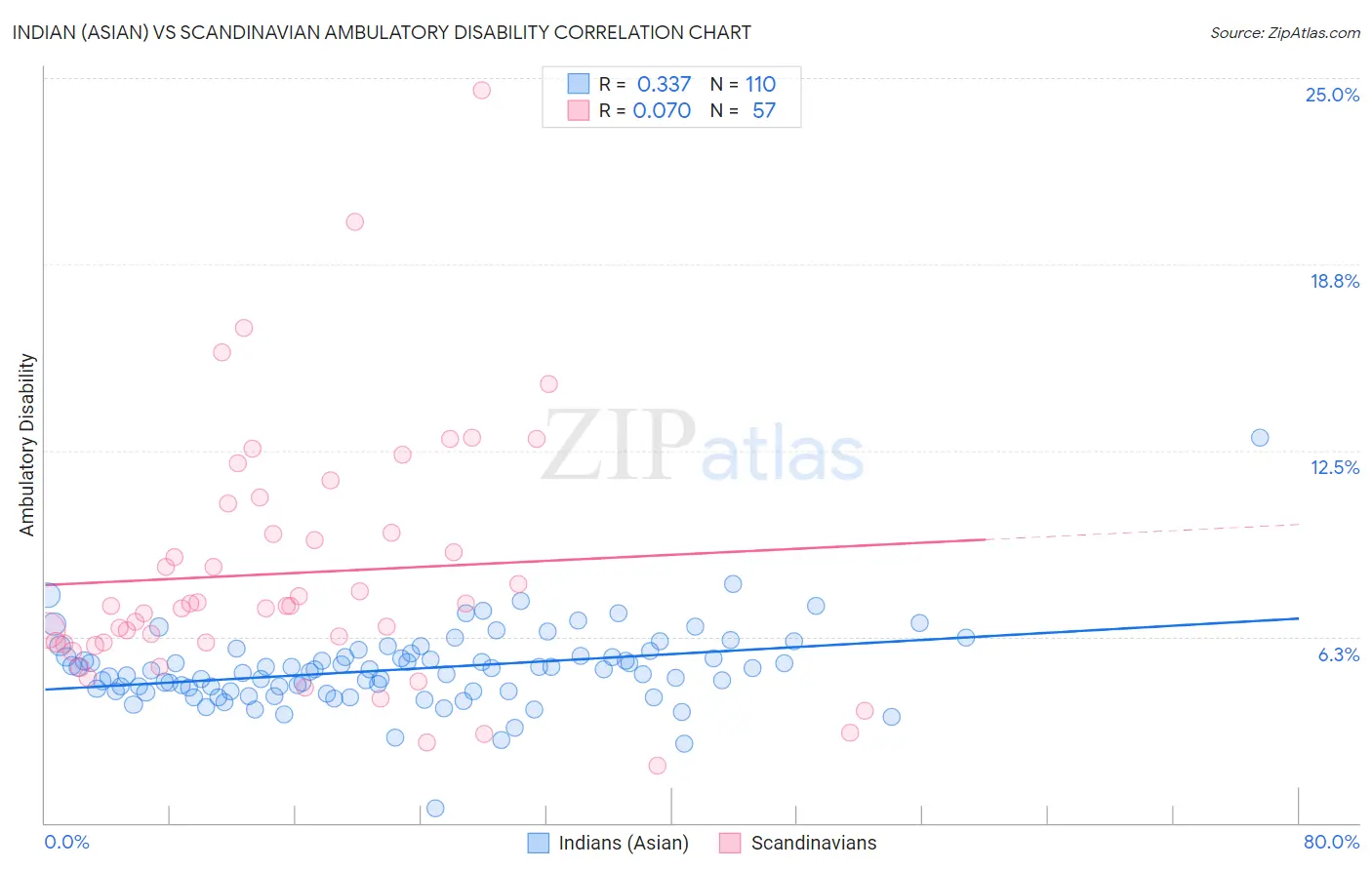 The statistical analysis conducted on geographies consisting of 495,002,853 people shows a mild positive correlation between the proportion of Indians (Asian) and percentage of population with ambulatory disability in the United States with a correlation coefficient (R) of 0.337 and weighted average of 5.4%. Similarly, the statistical analysis conducted on geographies consisting of 472,401,593 people shows a slight positive correlation between the proportion of Scandinavians and percentage of population with ambulatory disability in the United States with a correlation coefficient (R) of 0.070 and weighted average of 6.1%, a difference of 14.4%.