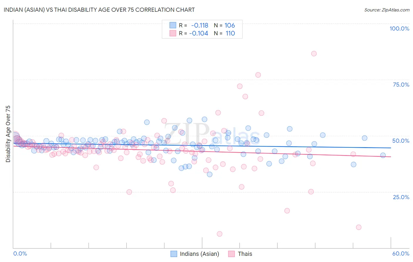 The statistical analysis conducted on geographies consisting of 493,822,739 people shows a poor negative correlation between the proportion of Indians (Asian) and percentage of population with a disability over the age of 75 in the United States with a correlation coefficient (R) of -0.118 and weighted average of 46.5%. Similarly, the statistical analysis conducted on geographies consisting of 474,673,142 people shows a poor negative correlation between the proportion of Thais and percentage of population with a disability over the age of 75 in the United States with a correlation coefficient (R) of -0.104 and weighted average of 45.4%, a difference of 2.5%.