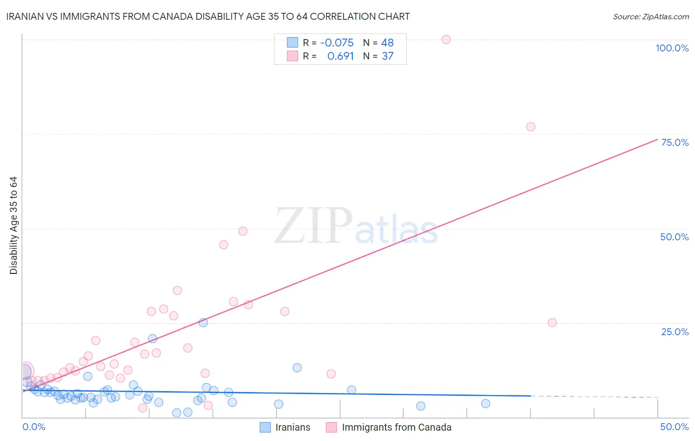 Iranian vs Immigrants from Canada Disability Age 35 to 64 Correlation Chart