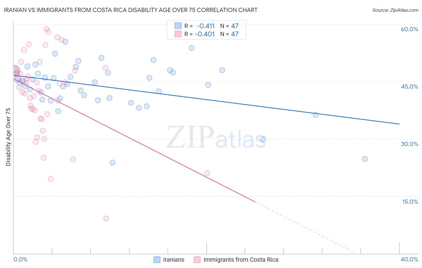 Iranian vs Immigrants from Costa Rica Disability Age Over 75 Correlation Chart