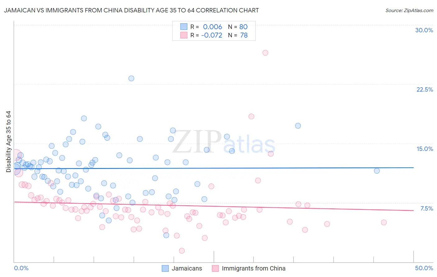 Jamaican vs Immigrants from China Disability Age 35 to 64 Correlation Chart