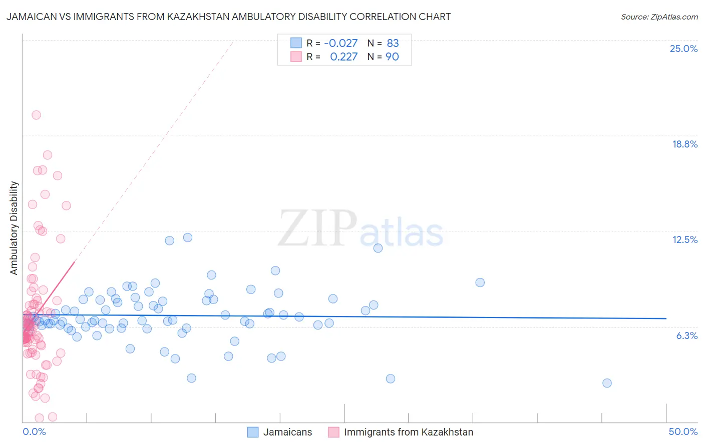 The statistical analysis conducted on geographies consisting of 367,821,612 people shows no correlation between the proportion of Jamaicans and percentage of population with ambulatory disability in the United States with a correlation coefficient (R) of -0.027 and weighted average of 6.7%. Similarly, the statistical analysis conducted on geographies consisting of 124,443,278 people shows a weak positive correlation between the proportion of Immigrants from Kazakhstan and percentage of population with ambulatory disability in the United States with a correlation coefficient (R) of 0.227 and weighted average of 5.9%, a difference of 13.1%.