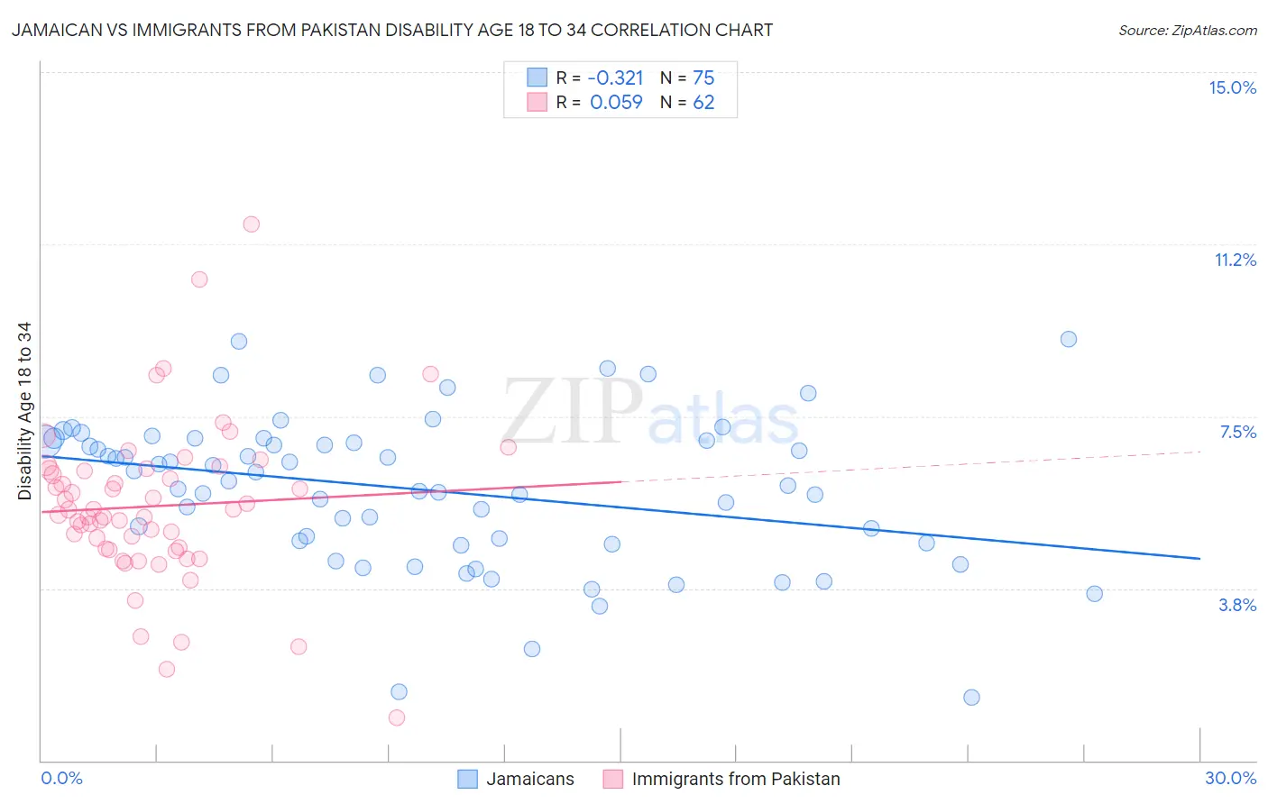 Jamaican vs Immigrants from Pakistan Disability Age 18 to 34