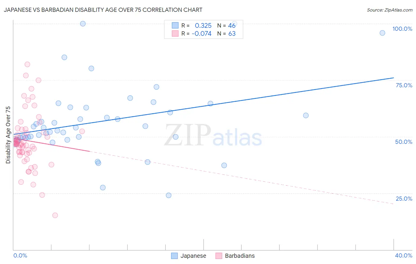 Japanese vs Barbadian Disability Age Over 75 Correlation Chart