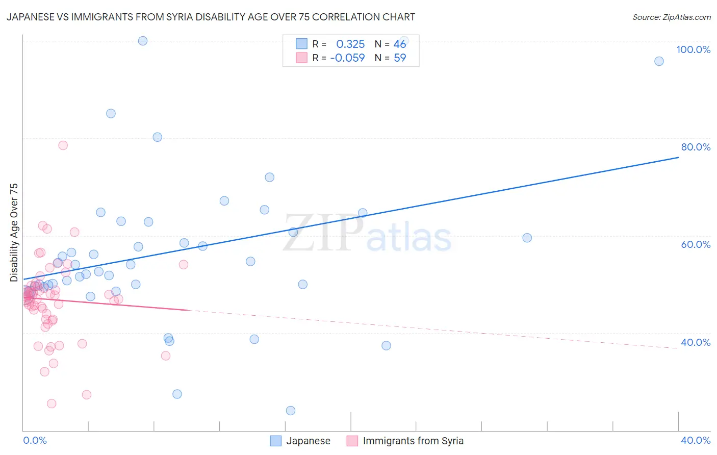 Japanese vs Immigrants from Syria Disability Age Over 75 Correlation Chart