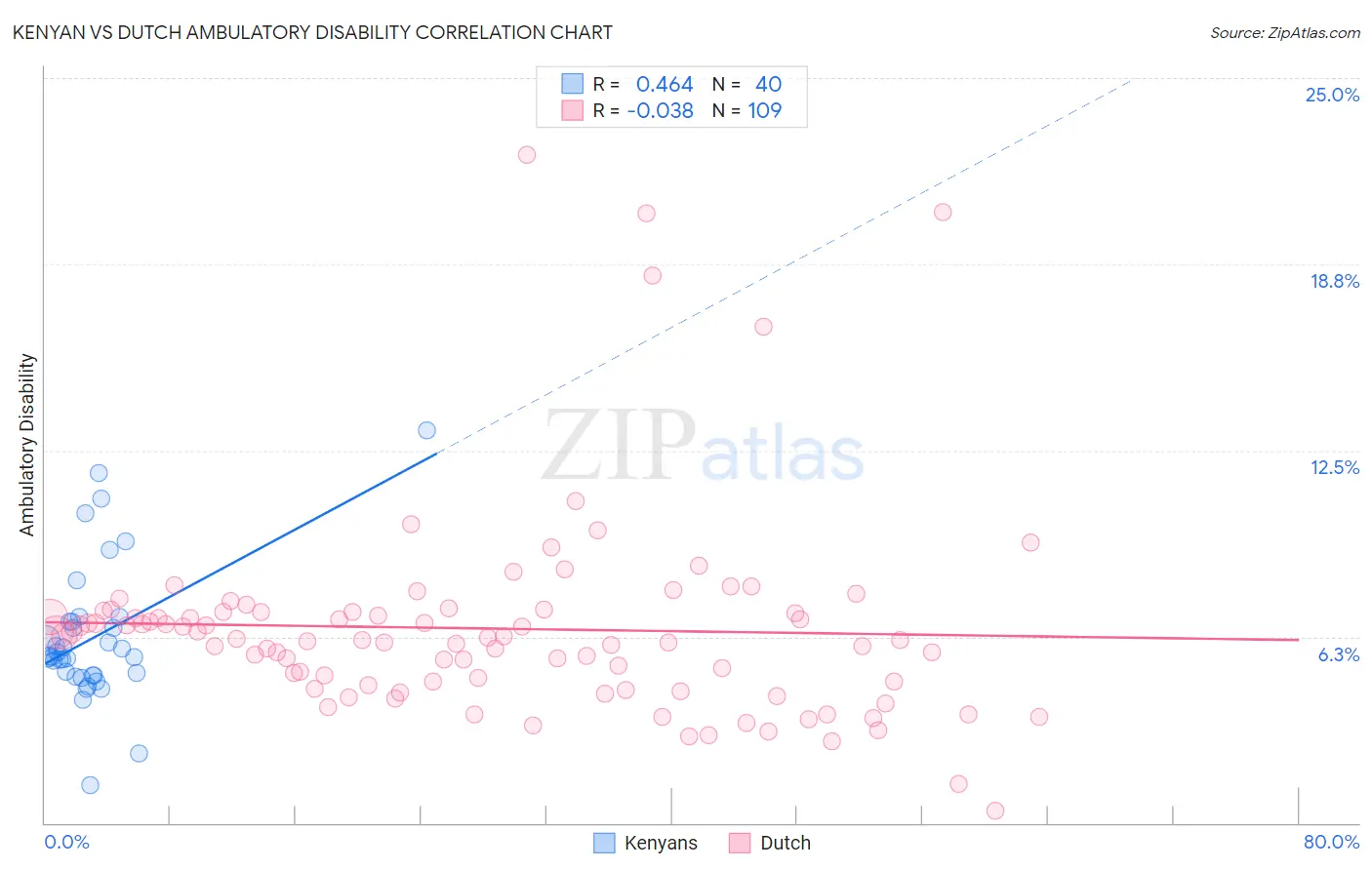 The statistical analysis conducted on geographies consisting of 168,175,436 people shows a moderate positive correlation between the proportion of Kenyans and percentage of population with ambulatory disability in the United States with a correlation coefficient (R) of 0.464 and weighted average of 5.8%. Similarly, the statistical analysis conducted on geographies consisting of 553,973,696 people shows no correlation between the proportion of Dutch and percentage of population with ambulatory disability in the United States with a correlation coefficient (R) of -0.038 and weighted average of 6.4%, a difference of 11.3%.