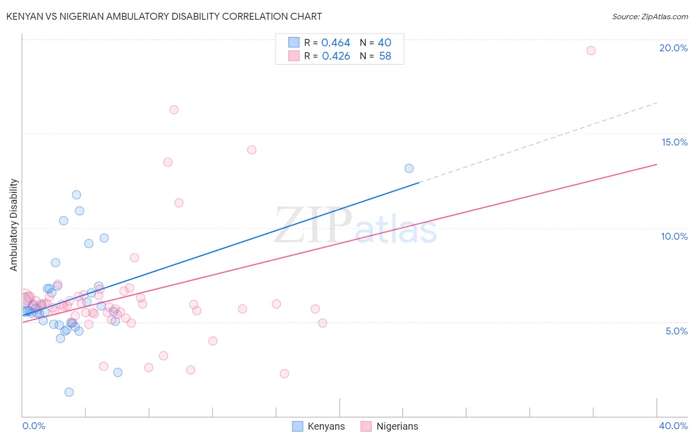 The statistical analysis conducted on geographies consisting of 168,175,436 people shows a moderate positive correlation between the proportion of Kenyans and percentage of population with ambulatory disability in the United States with a correlation coefficient (R) of 0.464 and weighted average of 5.8%. Similarly, the statistical analysis conducted on geographies consisting of 332,639,431 people shows a moderate positive correlation between the proportion of Nigerians and percentage of population with ambulatory disability in the United States with a correlation coefficient (R) of 0.426 and weighted average of 6.1%, a difference of 4.8%.