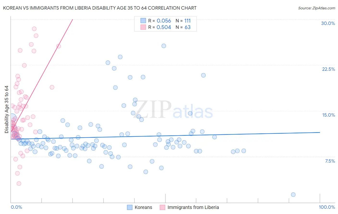 Korean vs Immigrants from Liberia Disability Age 35 to 64 Correlation Chart