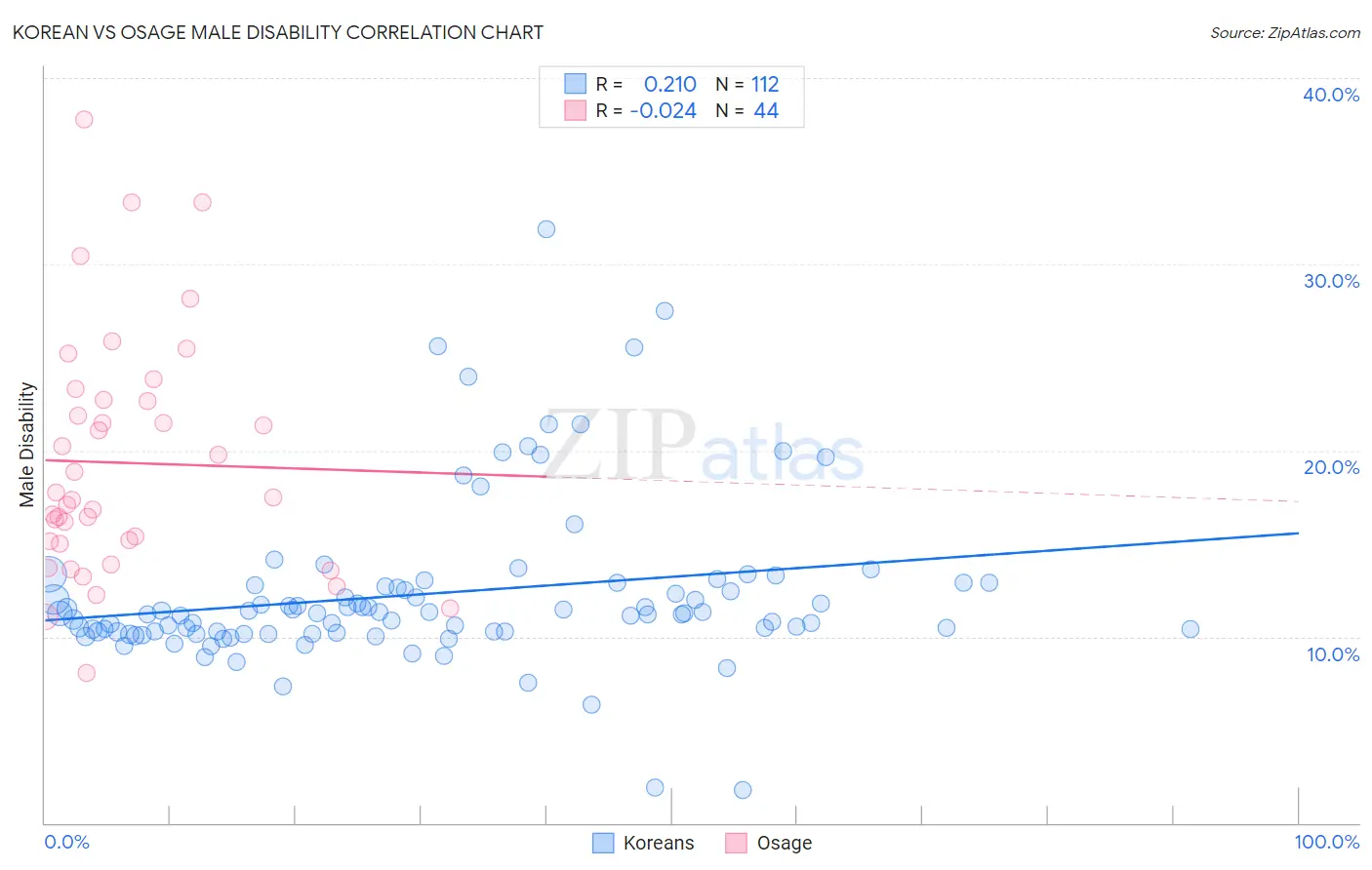 Korean vs Osage Male Disability Correlation Chart