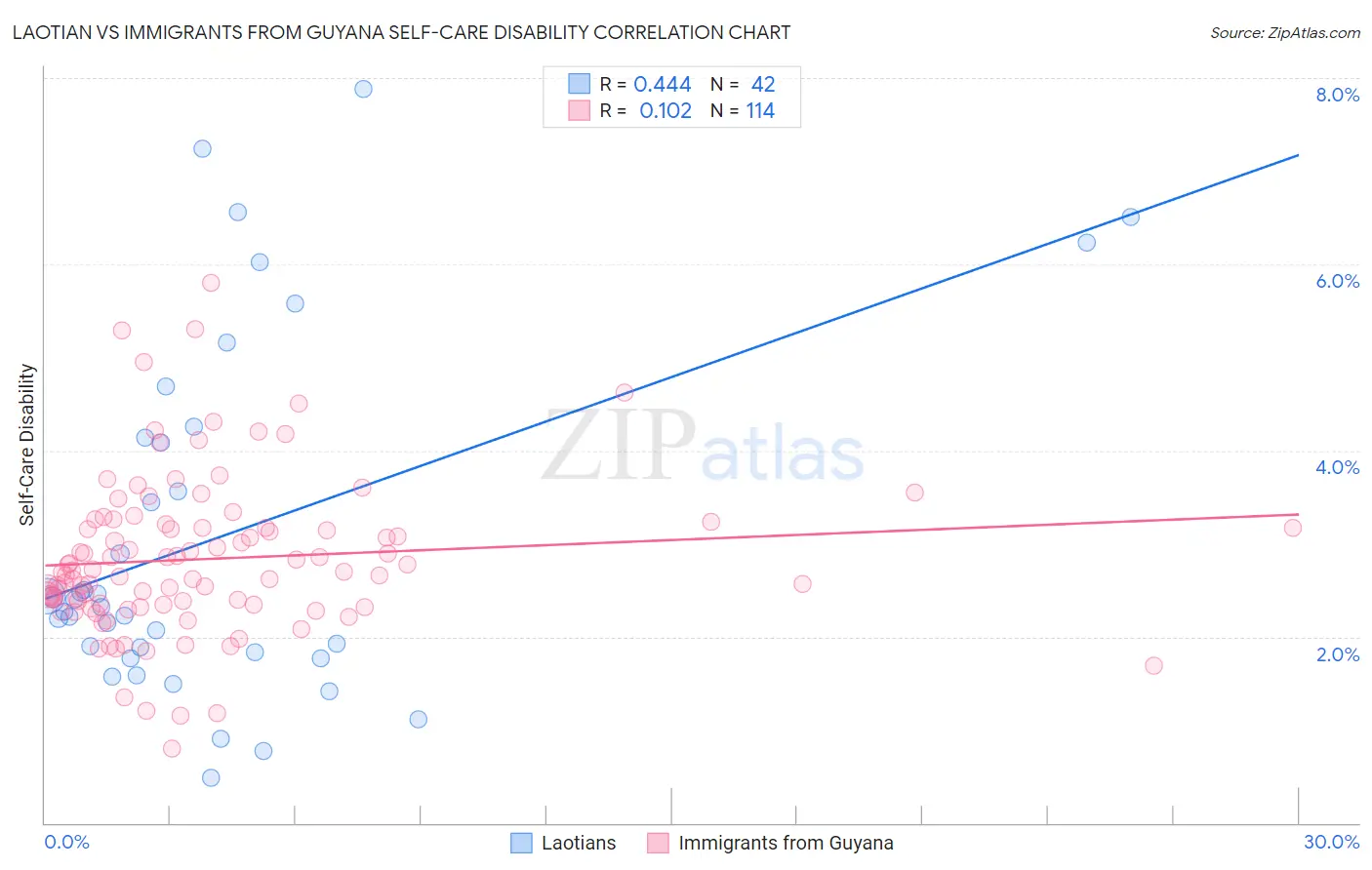 Laotian vs Immigrants from Guyana Self-Care Disability Correlation Chart