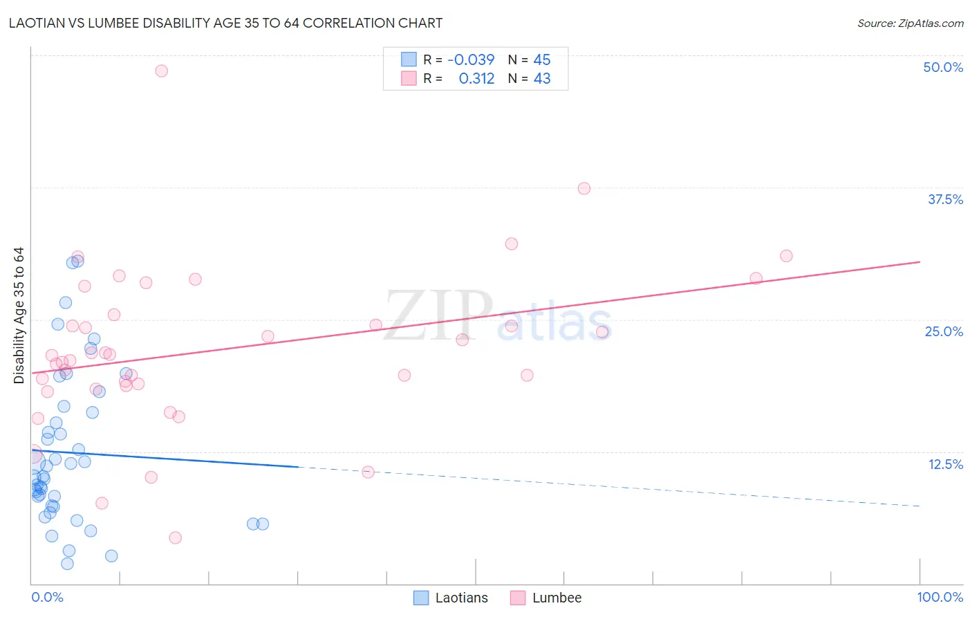 Laotian vs Lumbee Disability Age 35 to 64 Correlation Chart