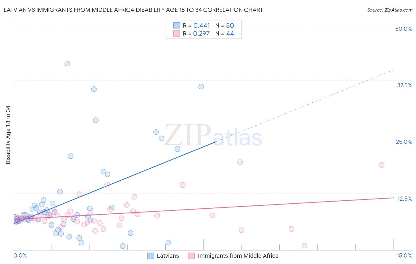 Latvian vs Immigrants from Middle Africa Disability Age 18 to 34 Correlation Chart