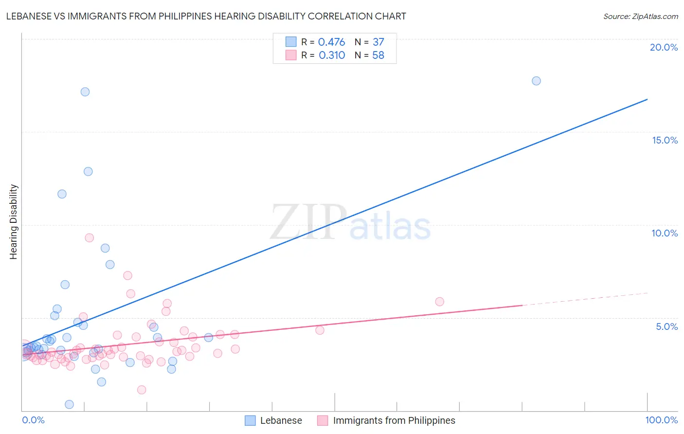 Lebanese vs Immigrants from Philippines Hearing Disability Correlation Chart