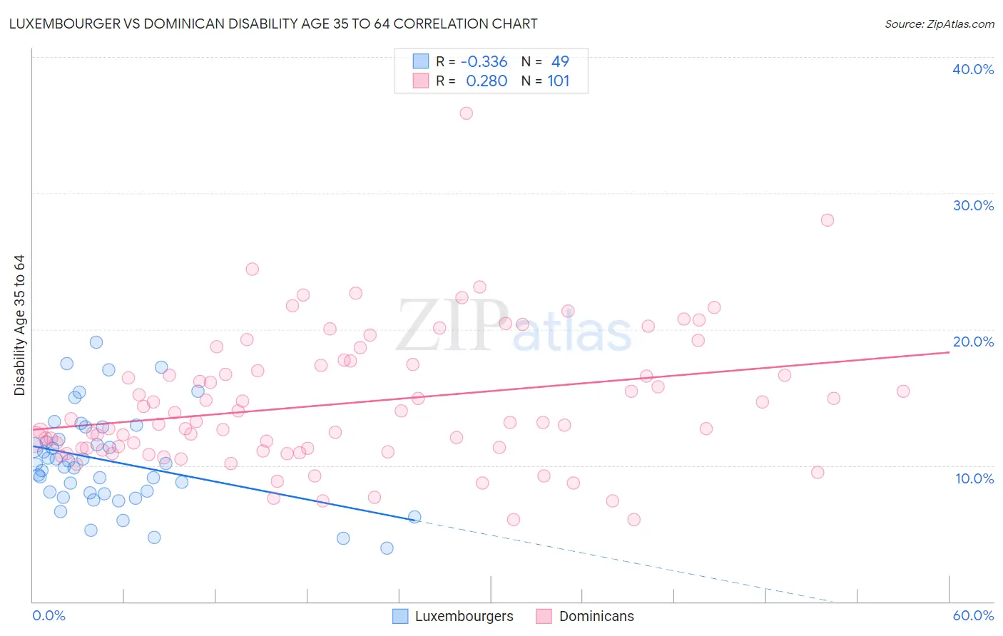 Luxembourger vs Dominican Disability Age 35 to 64 Correlation Chart