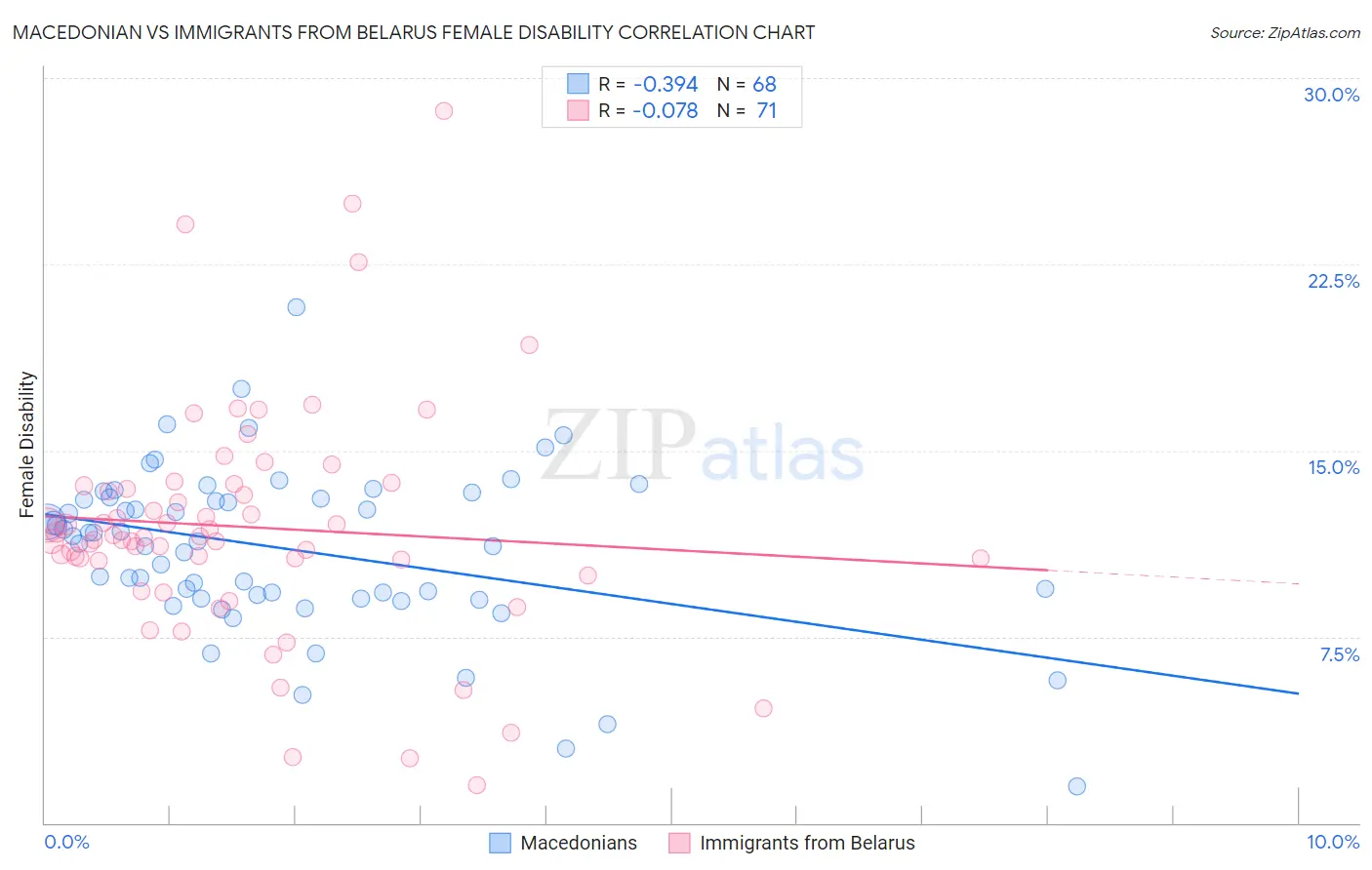 The statistical analysis conducted on geographies consisting of 132,656,541 people shows a mild negative correlation between the proportion of Macedonians and percentage of females with a disability in the United States with a correlation coefficient (R) of -0.394 and weighted average of 11.8%. Similarly, the statistical analysis conducted on geographies consisting of 150,193,098 people shows a slight negative correlation between the proportion of Immigrants from Belarus and percentage of females with a disability in the United States with a correlation coefficient (R) of -0.078 and weighted average of 11.8%, a difference of 0.72%.