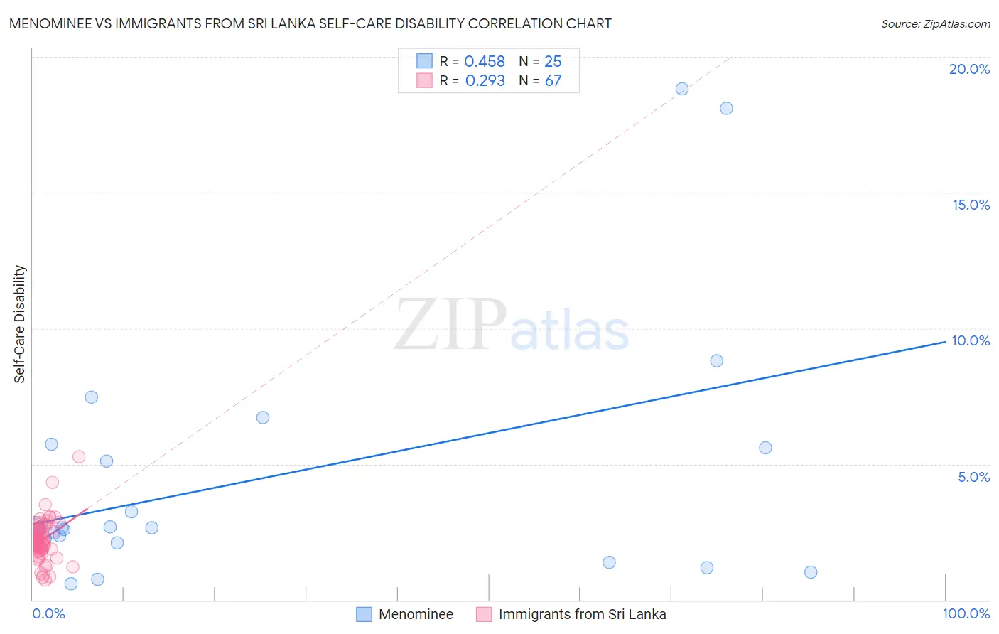 Menominee vs Immigrants from Sri Lanka Self-Care Disability Correlation Chart