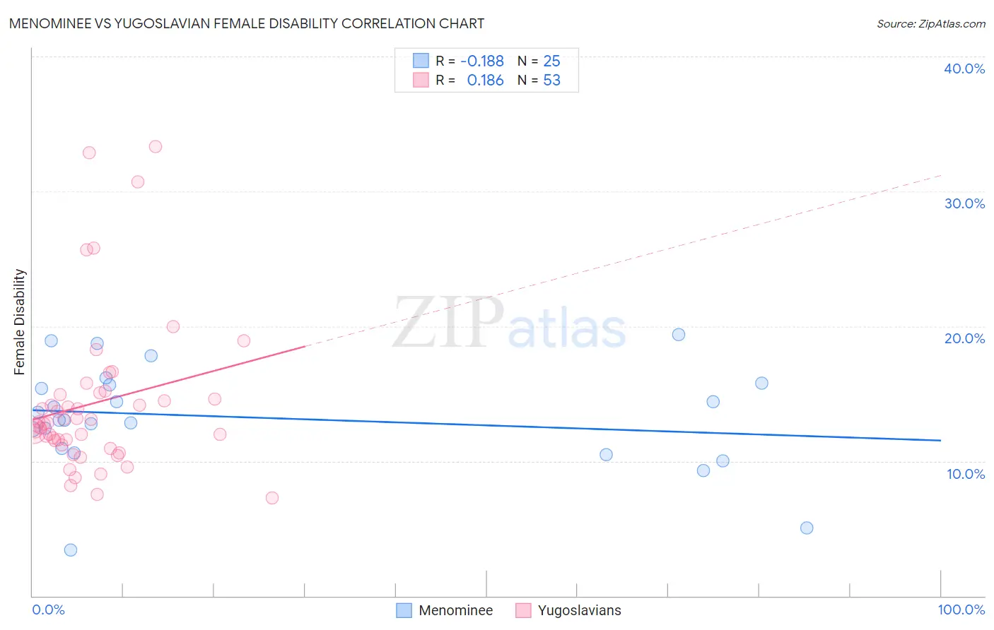 Menominee vs Yugoslavian Female Disability Correlation Chart