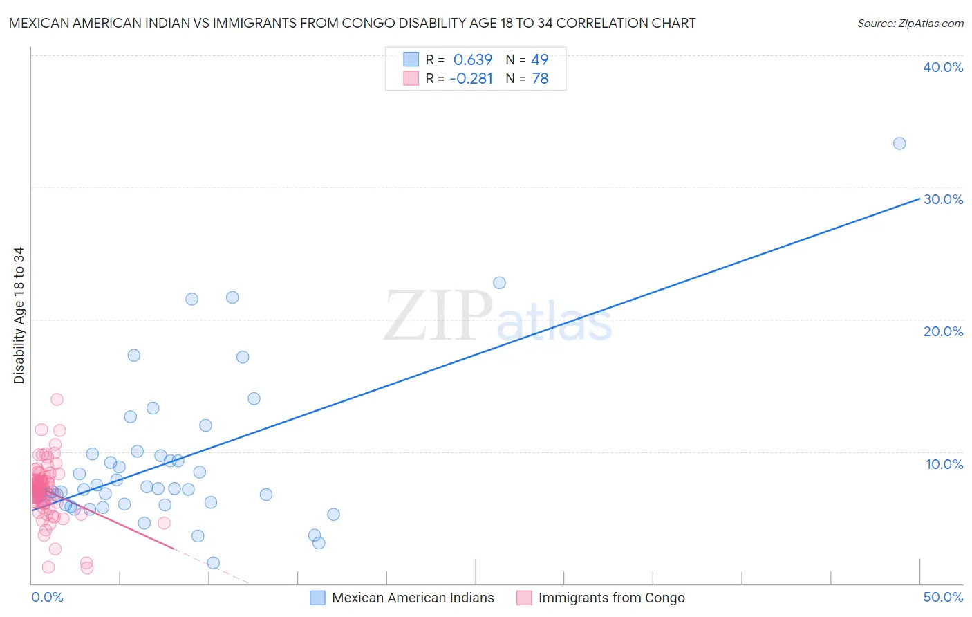 Mexican American Indian vs Immigrants from Congo Disability Age 18 to 34 Correlation Chart