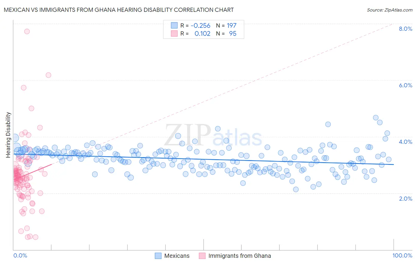 Mexican vs Immigrants from Ghana Hearing Disability Correlation Chart