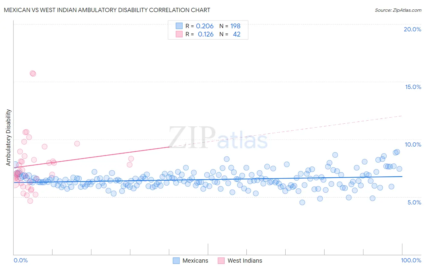 The statistical analysis conducted on geographies consisting of 564,662,817 people shows a weak positive correlation between the proportion of Mexicans and percentage of population with ambulatory disability in the United States with a correlation coefficient (R) of 0.206 and weighted average of 6.4%. Similarly, the statistical analysis conducted on geographies consisting of 253,984,061 people shows a poor positive correlation between the proportion of West Indians and percentage of population with ambulatory disability in the United States with a correlation coefficient (R) of 0.126 and weighted average of 6.9%, a difference of 7.6%.