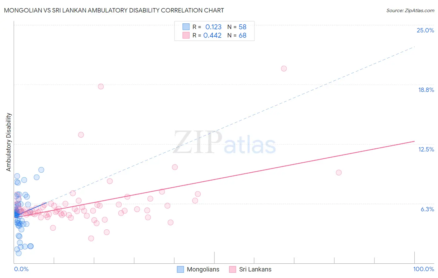 The statistical analysis conducted on geographies consisting of 140,347,726 people shows a poor positive correlation between the proportion of Mongolians and percentage of population with ambulatory disability in the United States with a correlation coefficient (R) of 0.123 and weighted average of 5.5%. Similarly, the statistical analysis conducted on geographies consisting of 440,321,822 people shows a moderate positive correlation between the proportion of Sri Lankans and percentage of population with ambulatory disability in the United States with a correlation coefficient (R) of 0.442 and weighted average of 5.7%, a difference of 2.8%.