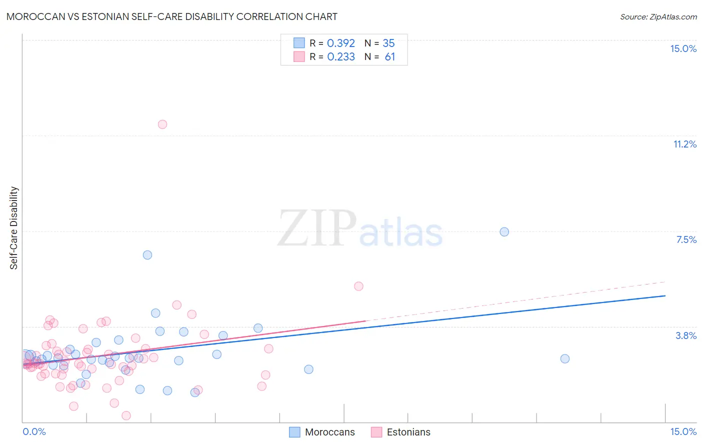 The statistical analysis conducted on geographies consisting of 201,730,975 people shows a mild positive correlation between the proportion of Moroccans and percentage of population with self-care disability in the United States with a correlation coefficient (R) of 0.392 and weighted average of 2.5%. Similarly, the statistical analysis conducted on geographies consisting of 123,478,369 people shows a weak positive correlation between the proportion of Estonians and percentage of population with self-care disability in the United States with a correlation coefficient (R) of 0.233 and weighted average of 2.3%, a difference of 6.6%.