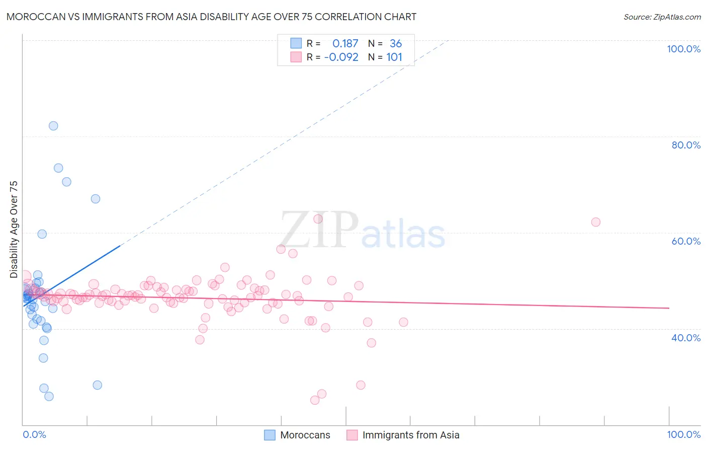 Moroccan vs Immigrants from Asia Disability Age Over 75 Correlation Chart