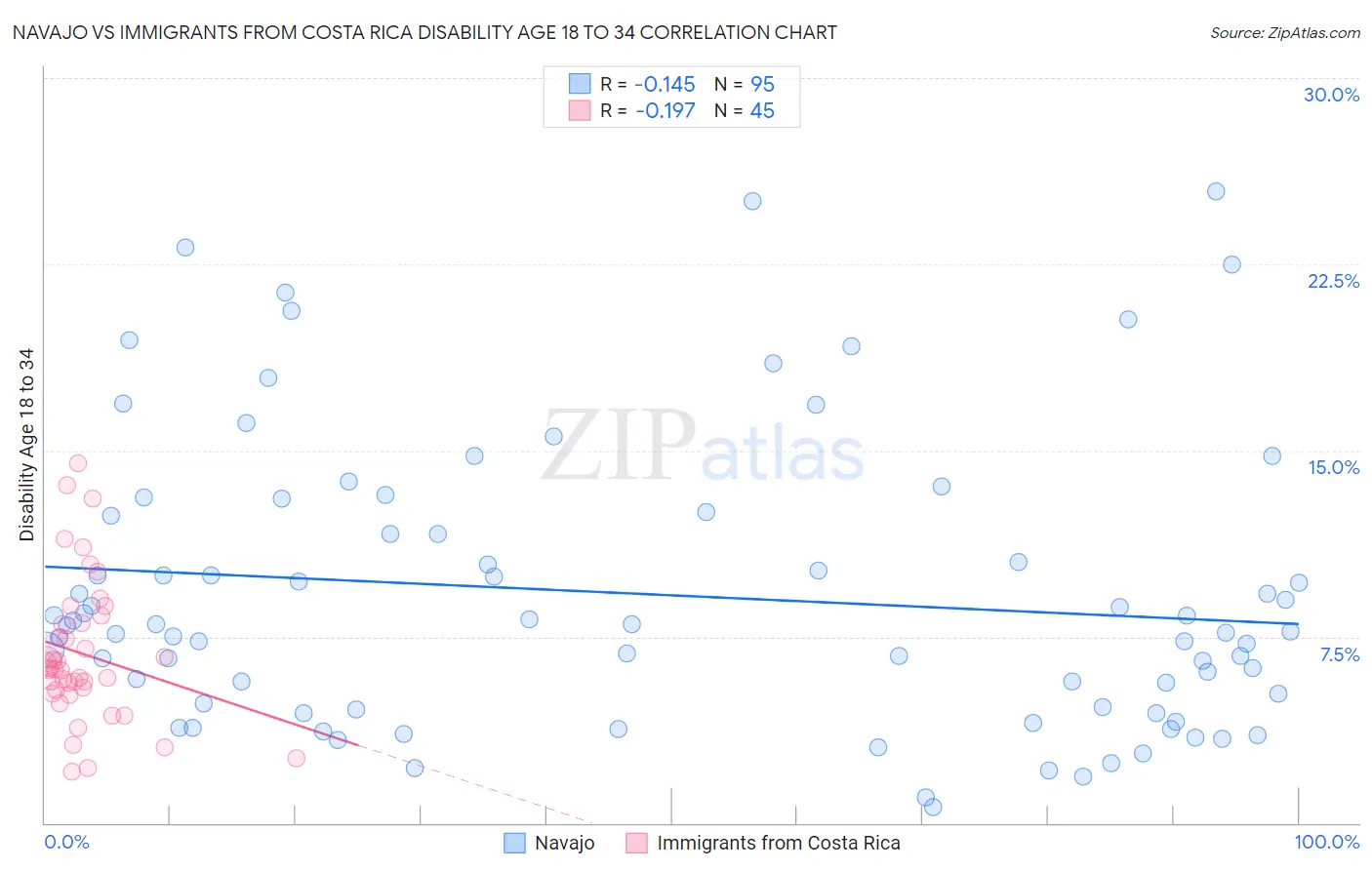 Navajo vs Immigrants from Costa Rica Disability Age 18 to 34 Correlation Chart