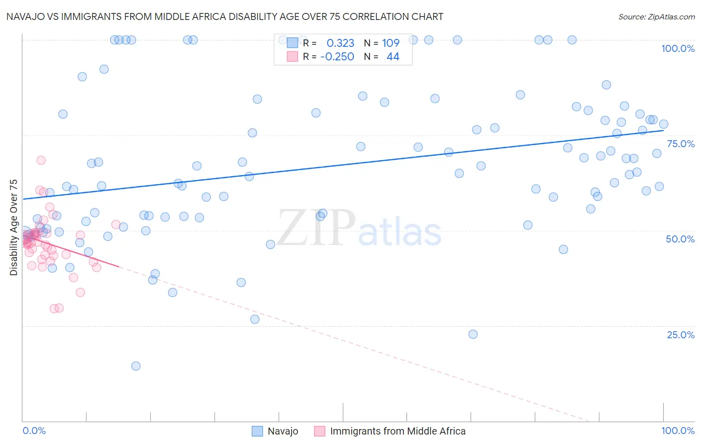 Navajo vs Immigrants from Middle Africa Disability Age Over 75 Correlation Chart