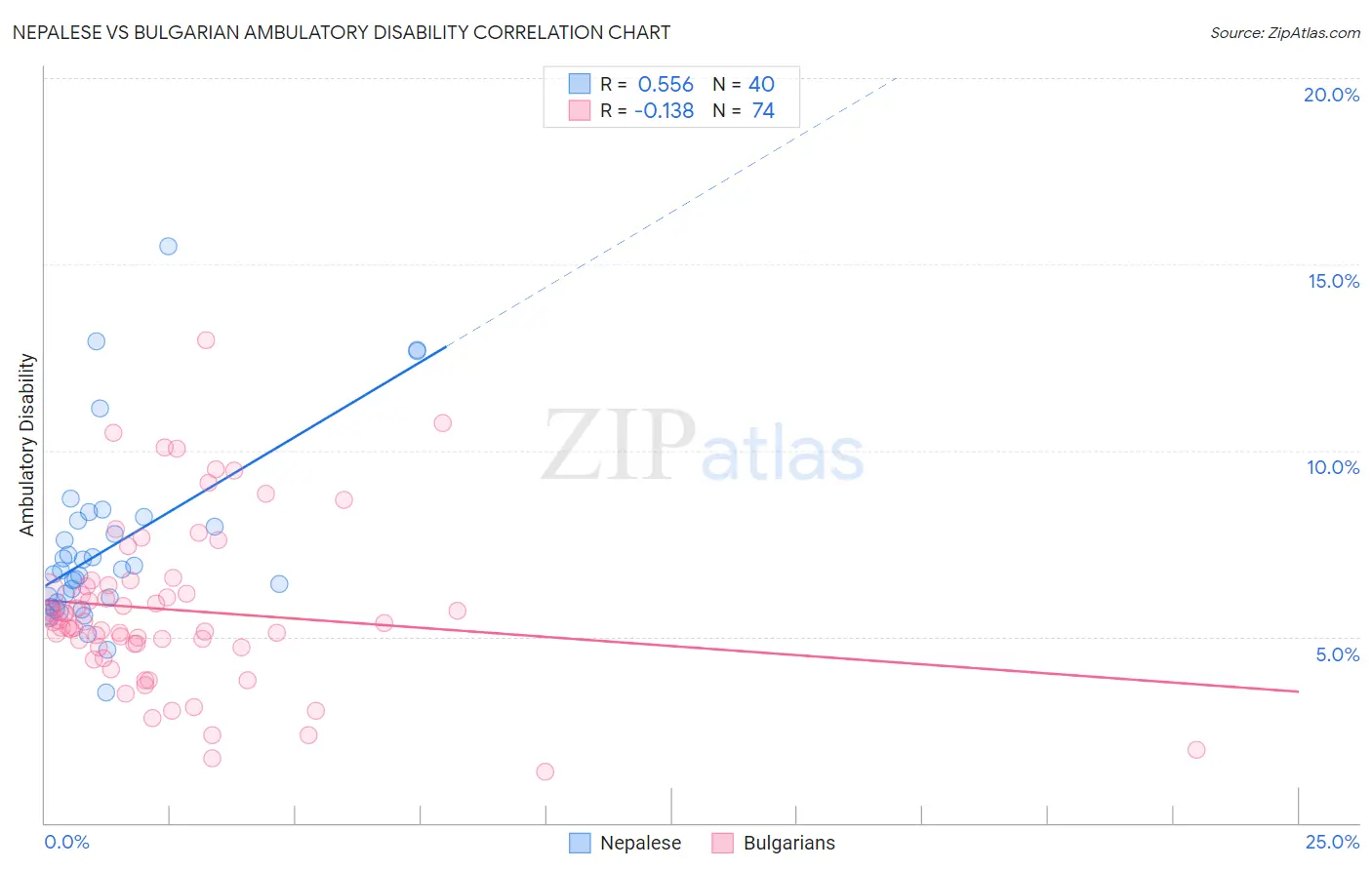 The statistical analysis conducted on geographies consisting of 24,521,755 people shows a substantial positive correlation between the proportion of Nepalese and percentage of population with ambulatory disability in the United States with a correlation coefficient (R) of 0.556 and weighted average of 6.6%. Similarly, the statistical analysis conducted on geographies consisting of 205,613,194 people shows a poor negative correlation between the proportion of Bulgarians and percentage of population with ambulatory disability in the United States with a correlation coefficient (R) of -0.138 and weighted average of 5.6%, a difference of 18.6%.