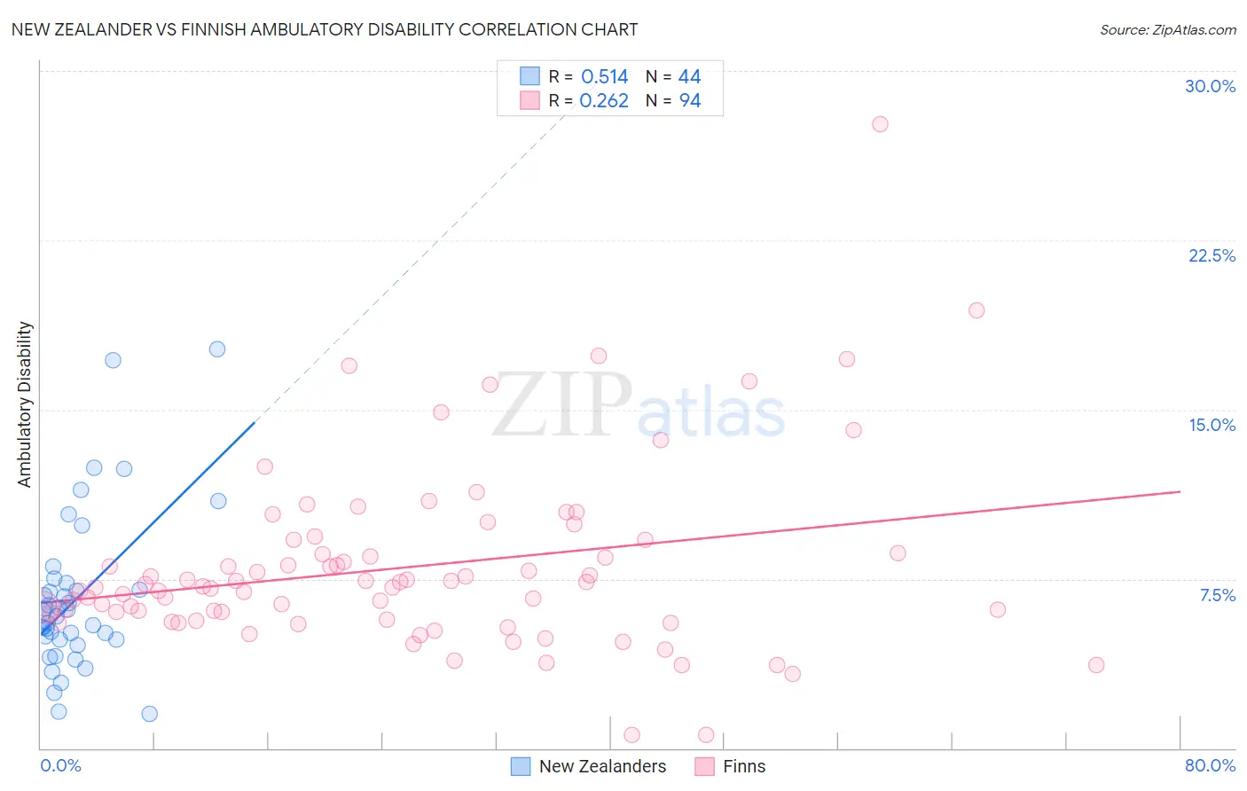 The statistical analysis conducted on geographies consisting of 106,904,660 people shows a substantial positive correlation between the proportion of New Zealanders and percentage of population with ambulatory disability in the United States with a correlation coefficient (R) of 0.514 and weighted average of 5.8%. Similarly, the statistical analysis conducted on geographies consisting of 404,562,886 people shows a weak positive correlation between the proportion of Finns and percentage of population with ambulatory disability in the United States with a correlation coefficient (R) of 0.262 and weighted average of 6.2%, a difference of 7.4%.