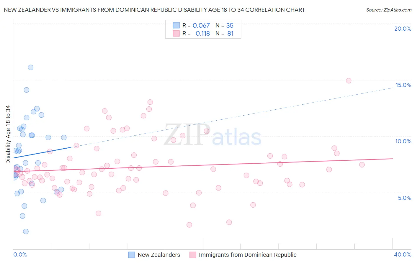 New Zealander vs Immigrants from Dominican Republic Disability Age 18 to 34 Correlation Chart