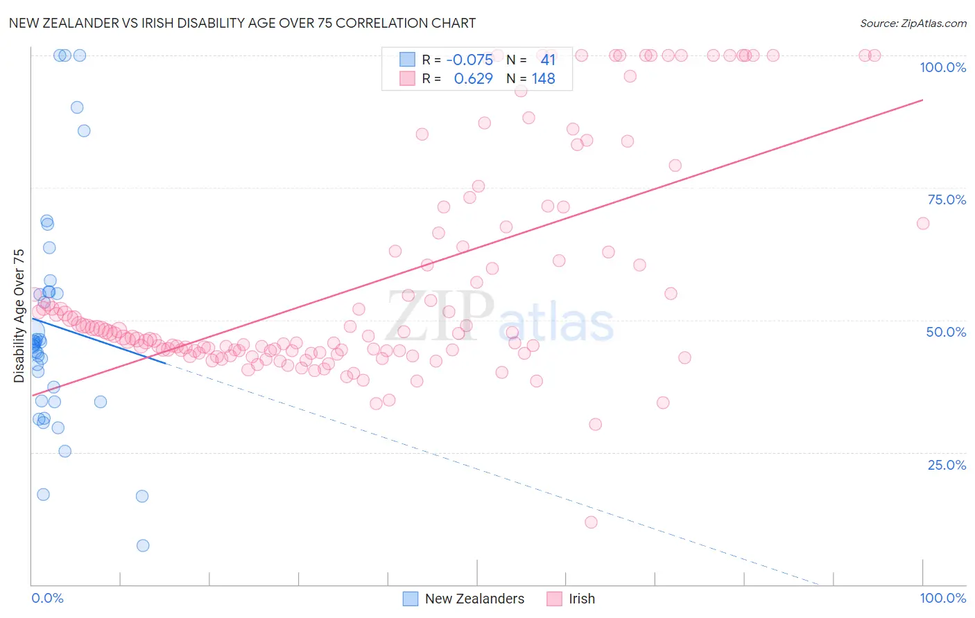 New Zealander vs Irish Disability Age Over 75 Correlation Chart