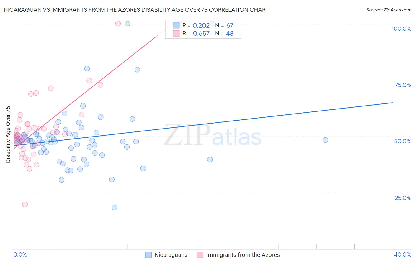 Nicaraguan vs Immigrants from the Azores Disability Age Over 75 Correlation Chart