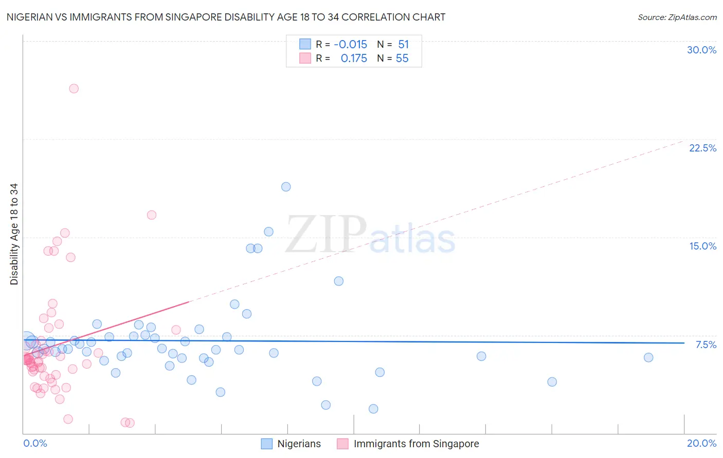 Nigerian vs Immigrants from Singapore Disability Age 18 to 34 Correlation Chart