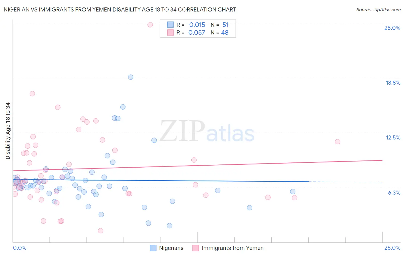 Nigerian vs Immigrants from Yemen Disability Age 18 to 34 Correlation Chart