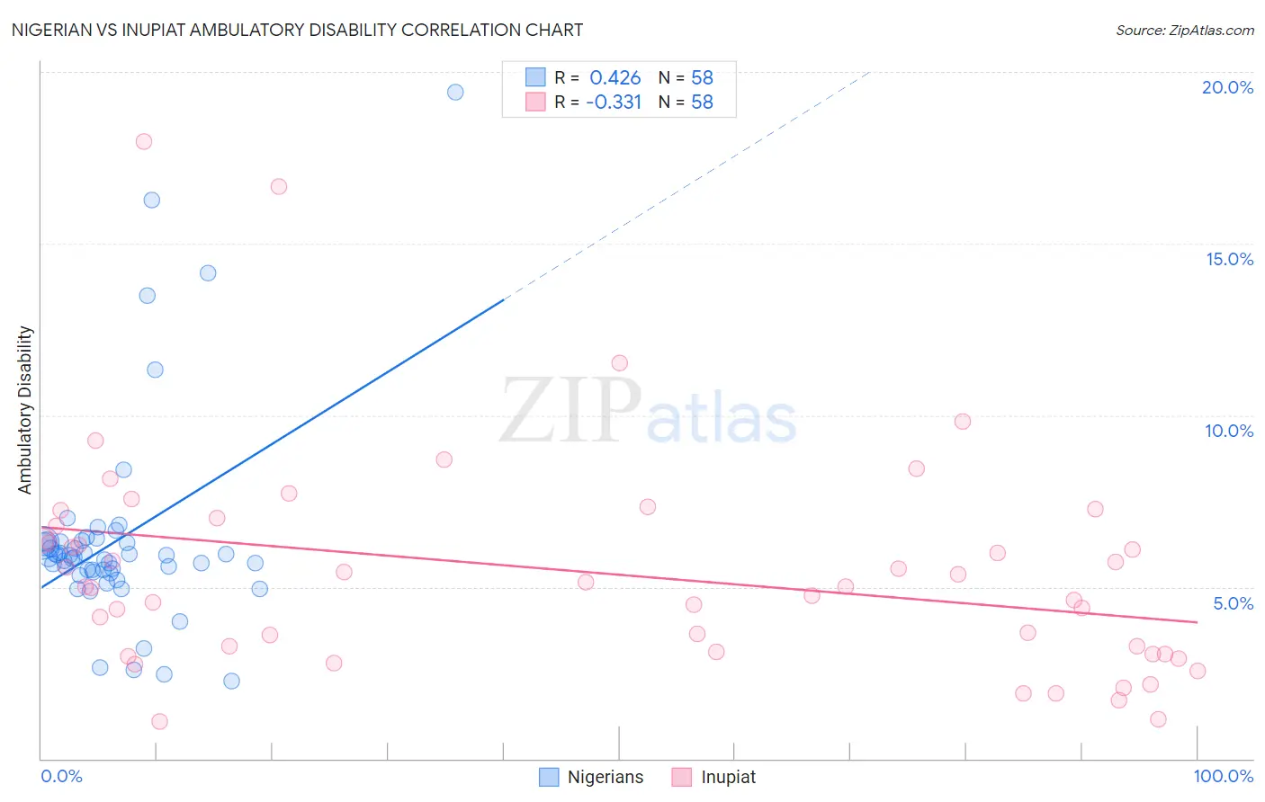 The statistical analysis conducted on geographies consisting of 332,639,431 people shows a moderate positive correlation between the proportion of Nigerians and percentage of population with ambulatory disability in the United States with a correlation coefficient (R) of 0.426 and weighted average of 6.1%. Similarly, the statistical analysis conducted on geographies consisting of 96,327,130 people shows a mild negative correlation between the proportion of Inupiat and percentage of population with ambulatory disability in the United States with a correlation coefficient (R) of -0.331 and weighted average of 5.6%, a difference of 8.0%.