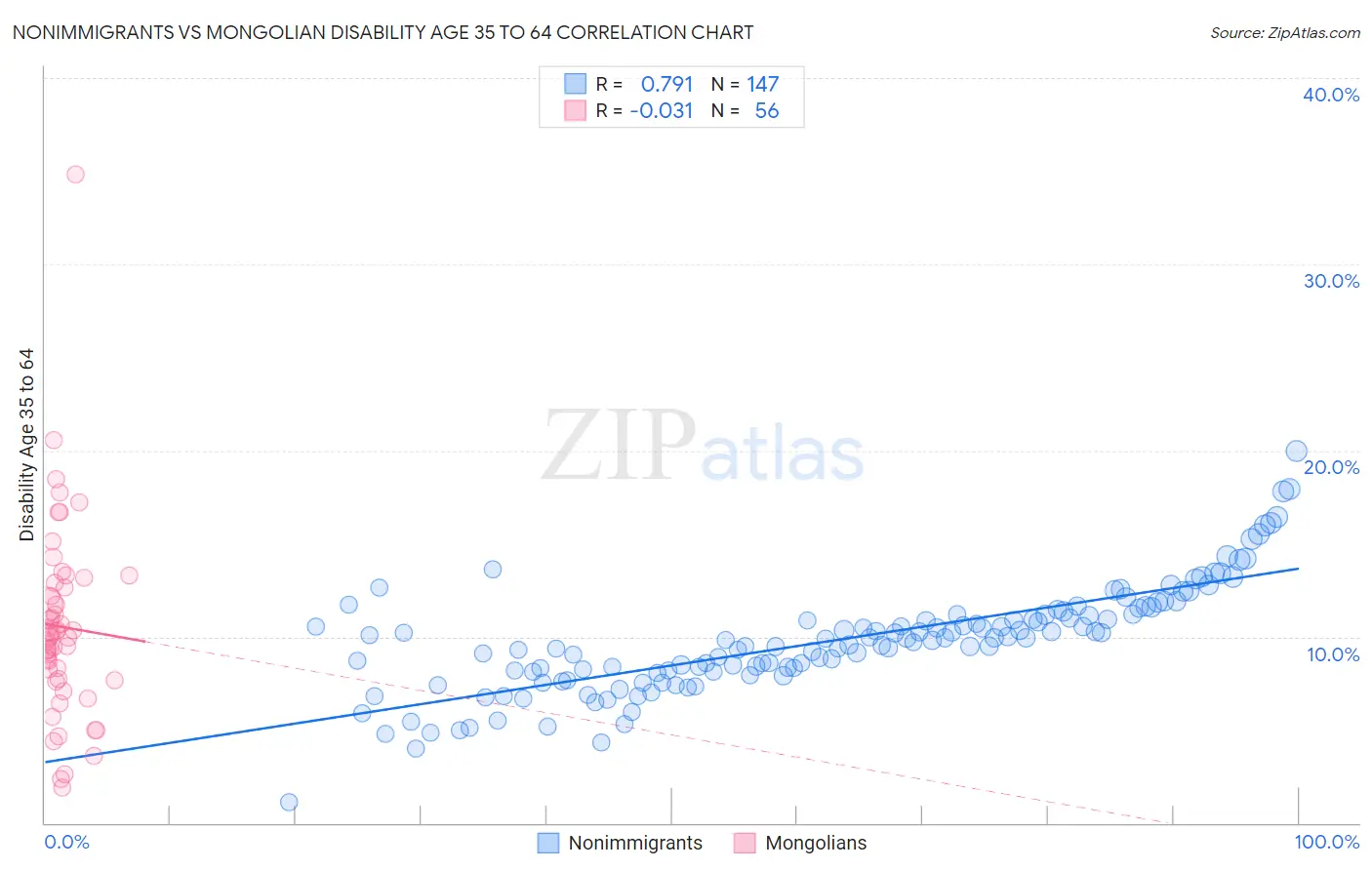 Nonimmigrants vs Mongolian Disability Age 35 to 64 Correlation Chart