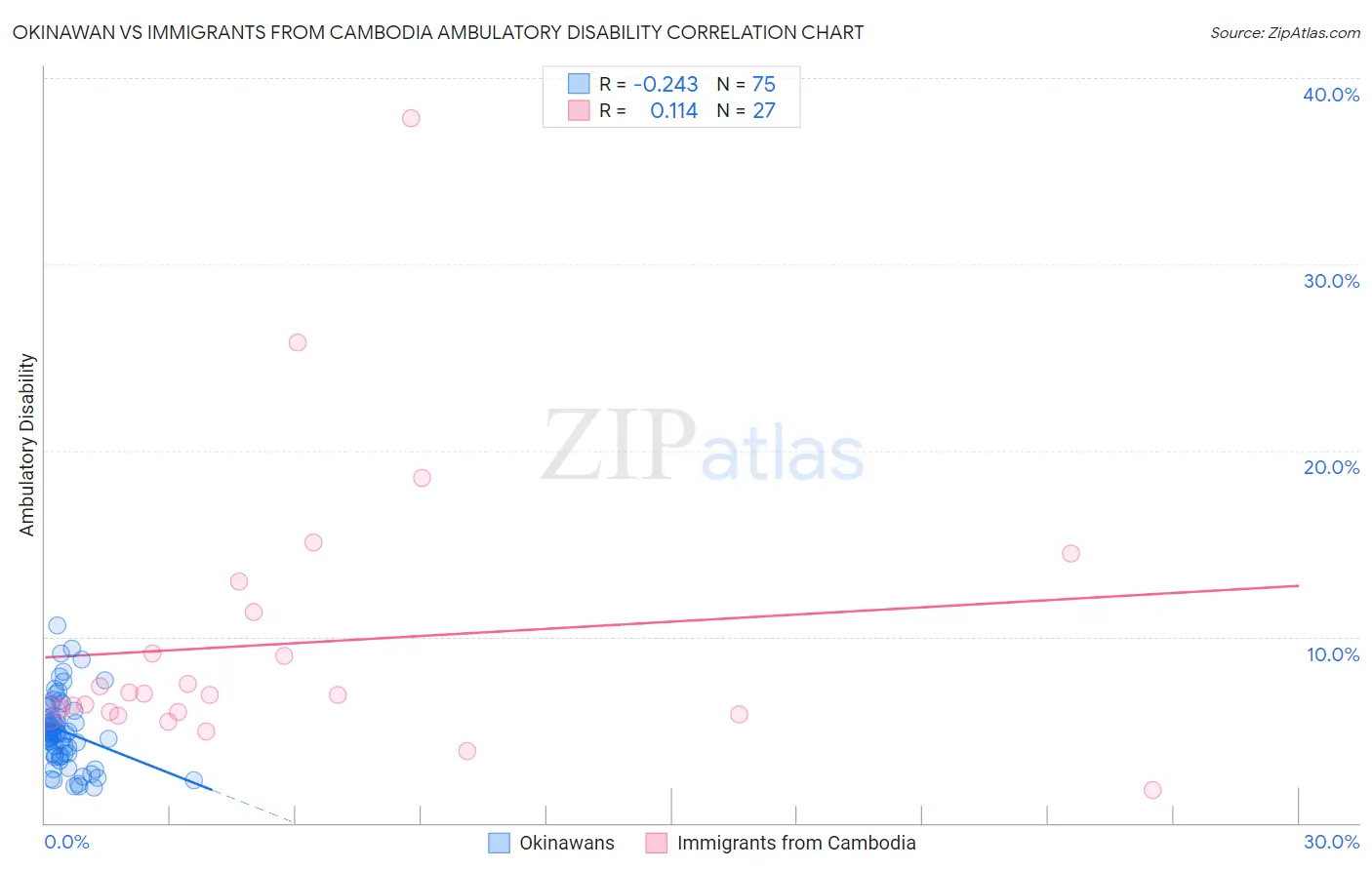 Okinawan vs Immigrants from Cambodia Ambulatory Disability Correlation Chart