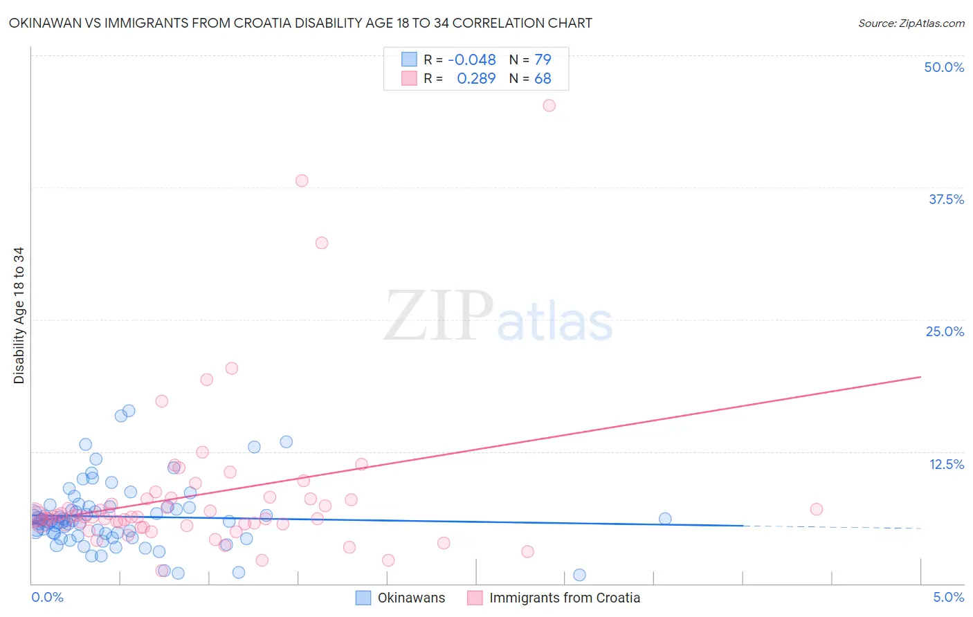 Okinawan vs Immigrants from Croatia Disability Age 18 to 34 Correlation Chart