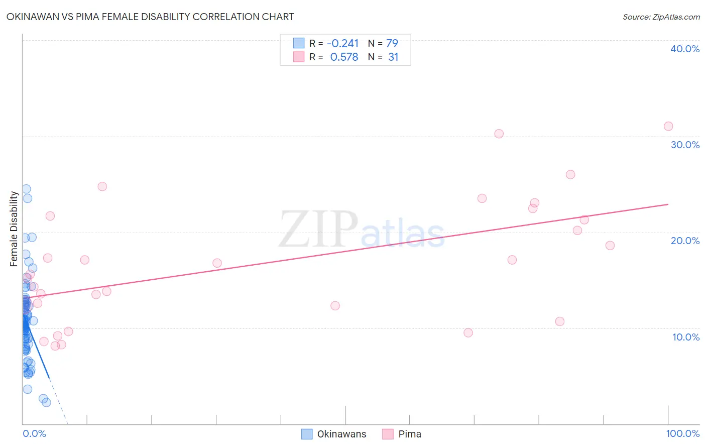 The statistical analysis conducted on geographies consisting of 73,779,497 people shows a weak negative correlation between the proportion of Okinawans and percentage of females with a disability in the United States with a correlation coefficient (R) of -0.241 and weighted average of 10.8%. Similarly, the statistical analysis conducted on geographies consisting of 61,537,754 people shows a substantial positive correlation between the proportion of Pima and percentage of females with a disability in the United States with a correlation coefficient (R) of 0.578 and weighted average of 14.8%, a difference of 37.5%.