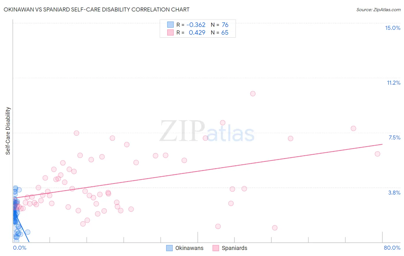 The statistical analysis conducted on geographies consisting of 73,715,651 people shows a mild negative correlation between the proportion of Okinawans and percentage of population with self-care disability in the United States with a correlation coefficient (R) of -0.362 and weighted average of 2.2%. Similarly, the statistical analysis conducted on geographies consisting of 442,715,832 people shows a moderate positive correlation between the proportion of Spaniards and percentage of population with self-care disability in the United States with a correlation coefficient (R) of 0.429 and weighted average of 2.6%, a difference of 16.5%.