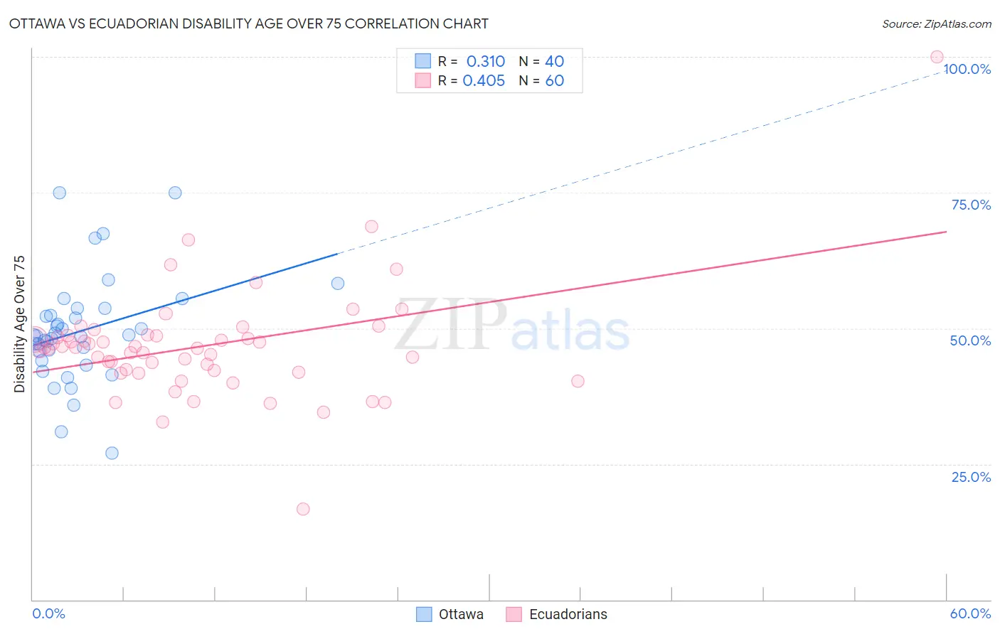 The statistical analysis conducted on geographies consisting of 49,925,299 people shows a mild positive correlation between the proportion of Ottawa and percentage of population with a disability over the age of 75 in the United States with a correlation coefficient (R) of 0.310 and weighted average of 47.6%. Similarly, the statistical analysis conducted on geographies consisting of 317,180,057 people shows a moderate positive correlation between the proportion of Ecuadorians and percentage of population with a disability over the age of 75 in the United States with a correlation coefficient (R) of 0.405 and weighted average of 47.4%, a difference of 0.45%.