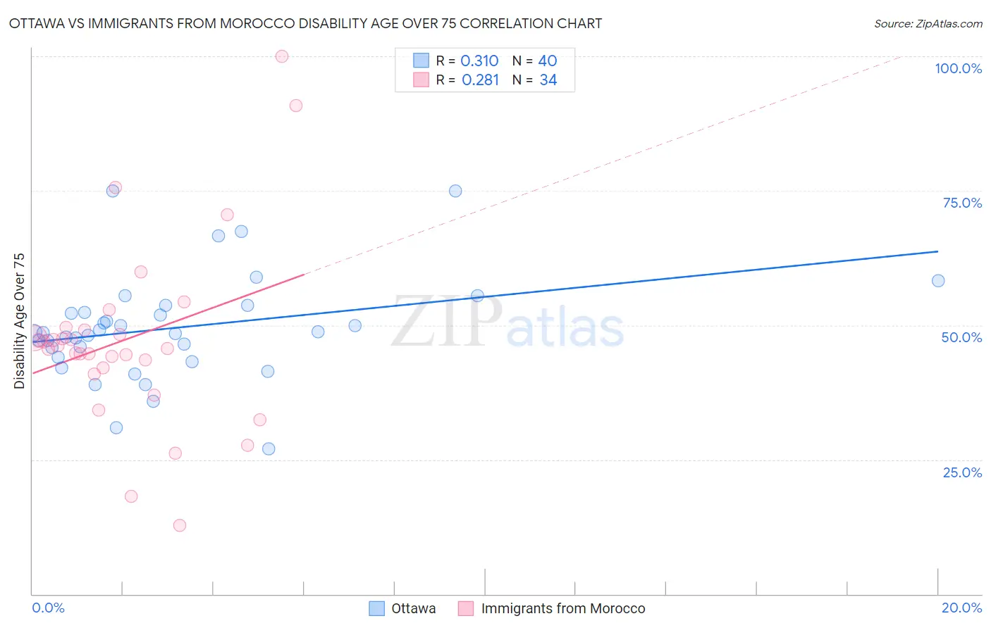 Ottawa vs Immigrants from Morocco Disability Age Over 75 Correlation Chart