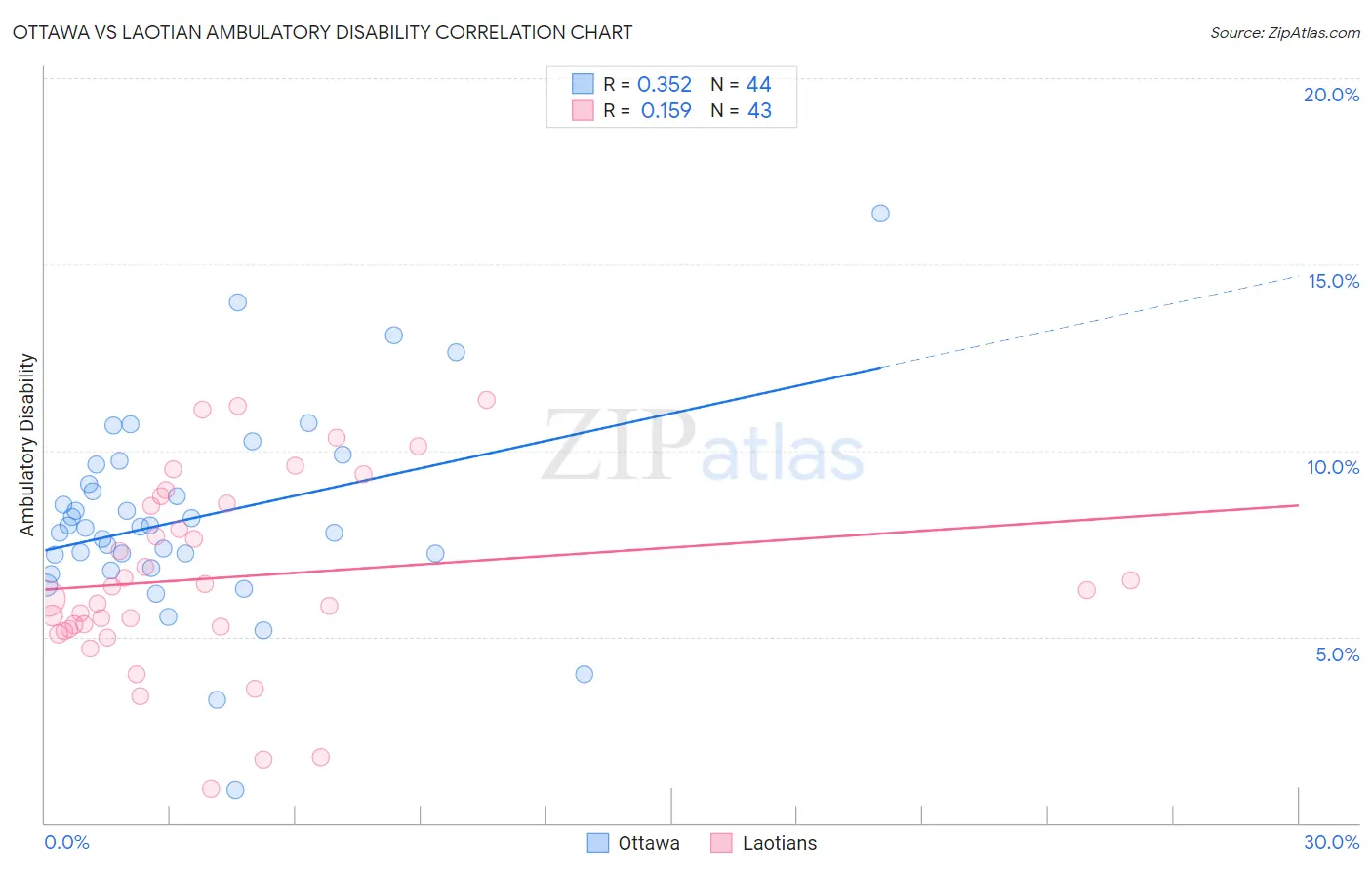 The statistical analysis conducted on geographies consisting of 49,954,761 people shows a mild positive correlation between the proportion of Ottawa and percentage of population with ambulatory disability in the United States with a correlation coefficient (R) of 0.352 and weighted average of 7.2%. Similarly, the statistical analysis conducted on geographies consisting of 224,814,363 people shows a poor positive correlation between the proportion of Laotians and percentage of population with ambulatory disability in the United States with a correlation coefficient (R) of 0.159 and weighted average of 5.7%, a difference of 26.7%.