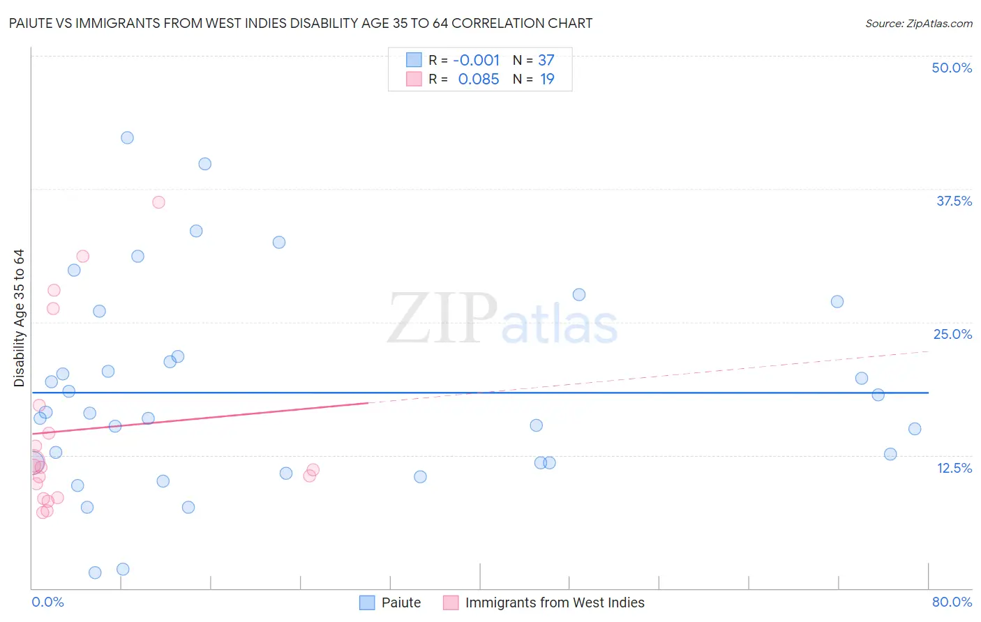 Paiute vs Immigrants from West Indies Disability Age 35 to 64 Correlation Chart